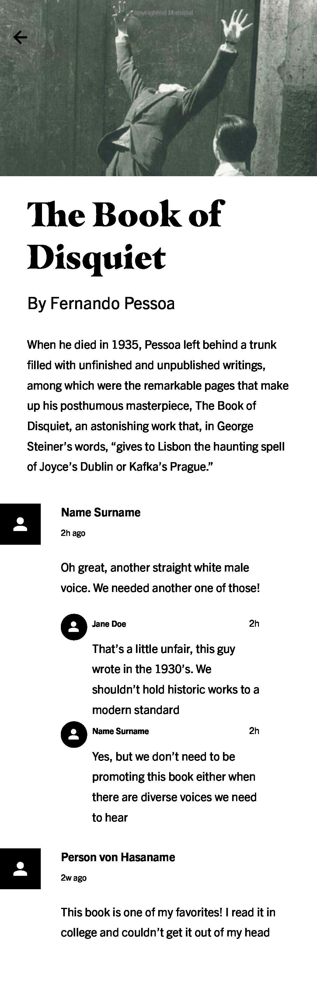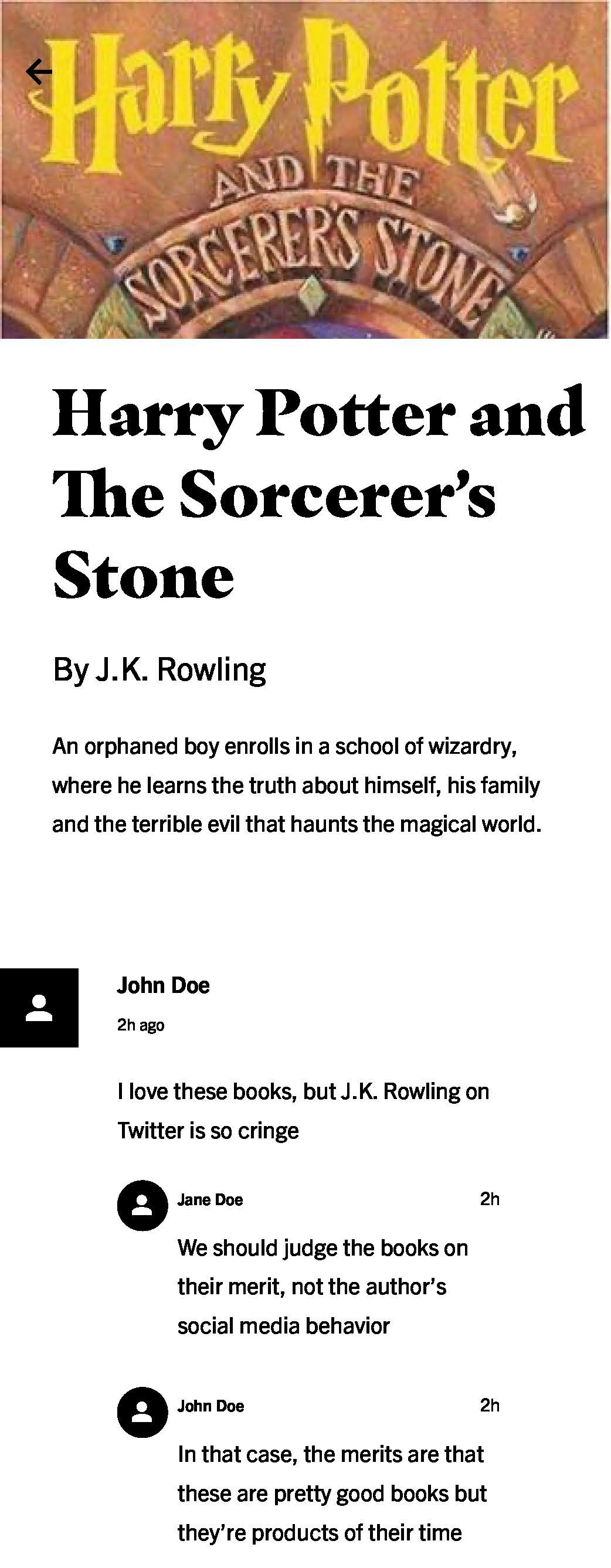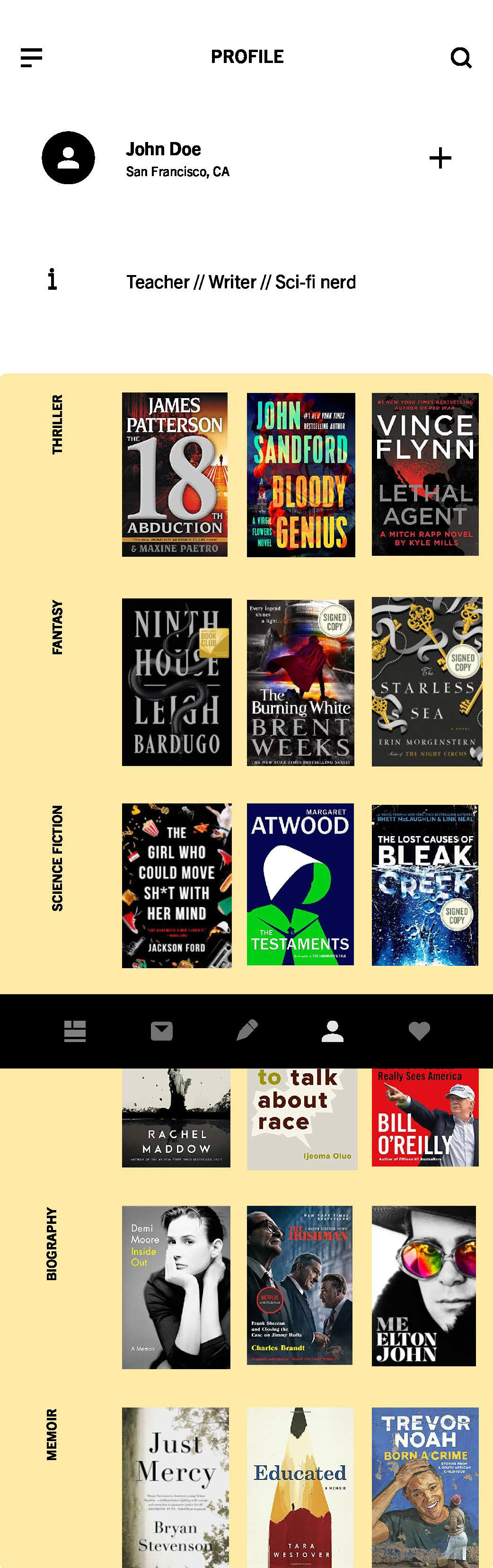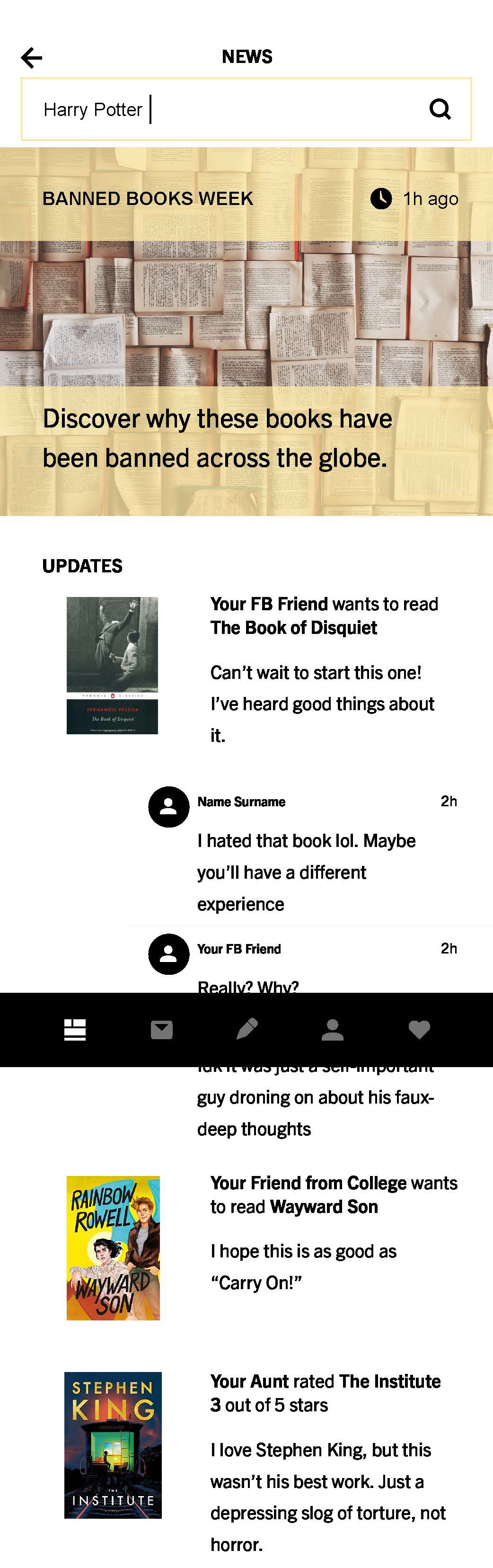 A UI of an app for a community of book lovers, and all the joys and hardships that come with that. An attempt to capture controversial #BookTwitter in a single app.